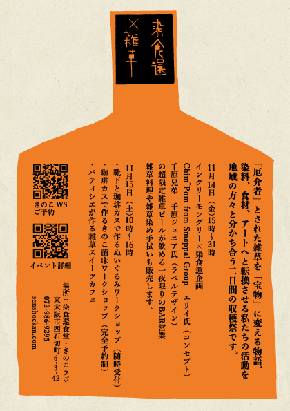 東大阪市五条町の耕作放棄地で「厄介者」とされた雑草を「宝物」に変える物語 。染料、食材、建材、へと転換させる私たちの活動を、地域の方々と分かち合う二日間の収穫祭です 。食やアート、会話を通じて、見過ごされた価値を再発見する楽しさを五感で体験して頂きます。